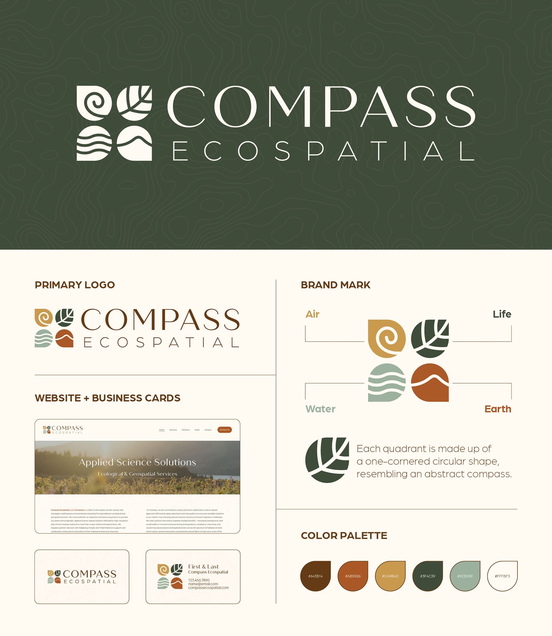 In the end, we settled on an abstract compass comprised of four one-cornered quadrants, each containing a symbol related to the environment: Air, Life, Water, and Earth. The brand mark was designed in such a way that the lines flow seamlessly between the quadrants. To pull everything together, I paired the brand mark with a thin, elegant font, an earthy color palette, and incorporated topography lines into the overall visual branding.