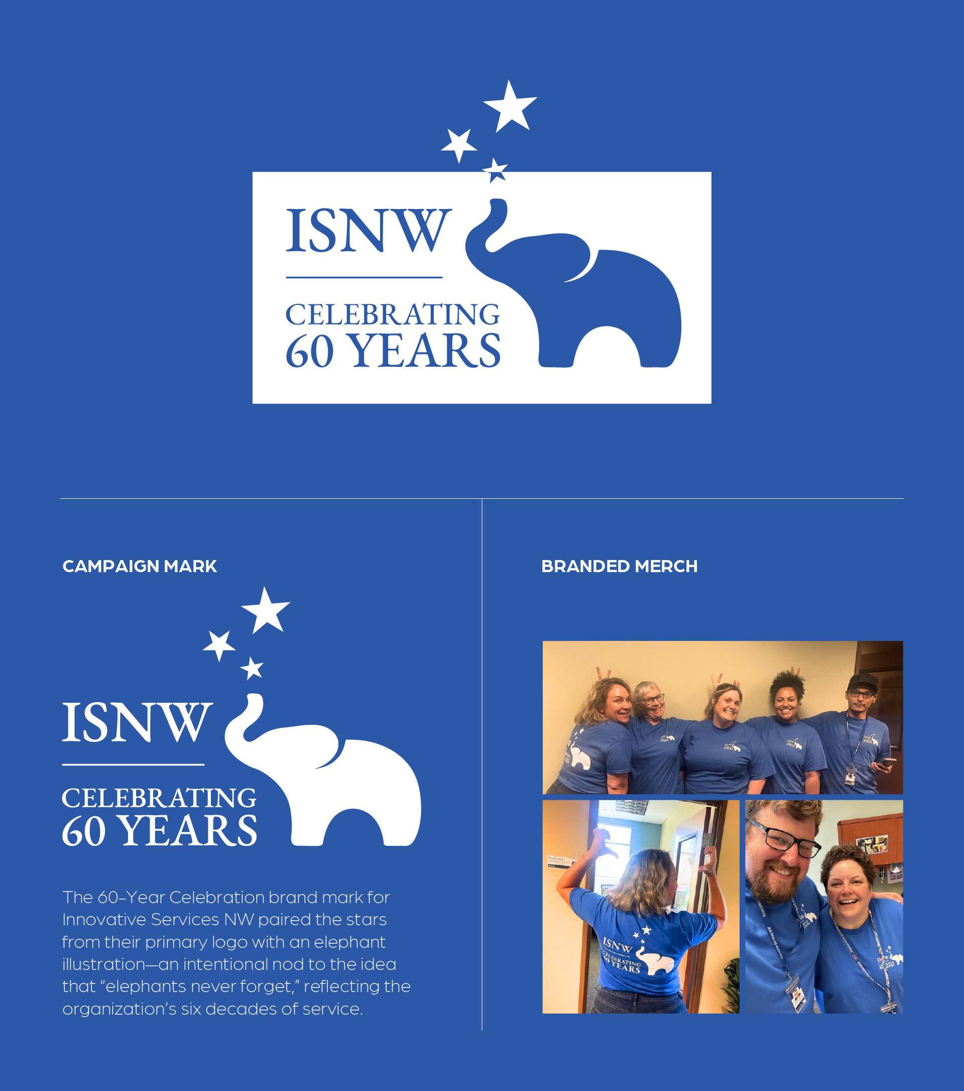 Innovative Services NW (now known as Strive NW) is a nonprofit organization based in Vancouver, Washington dedicated to supporting possibilities for everyone through pediatric therapy, early learning programs, and employment services. I was tasked with developing a brand mark for their 60-year anniversary campaign—a mark that complemented their main logo and incorporated an elephant for their incredible memory and sense of community.