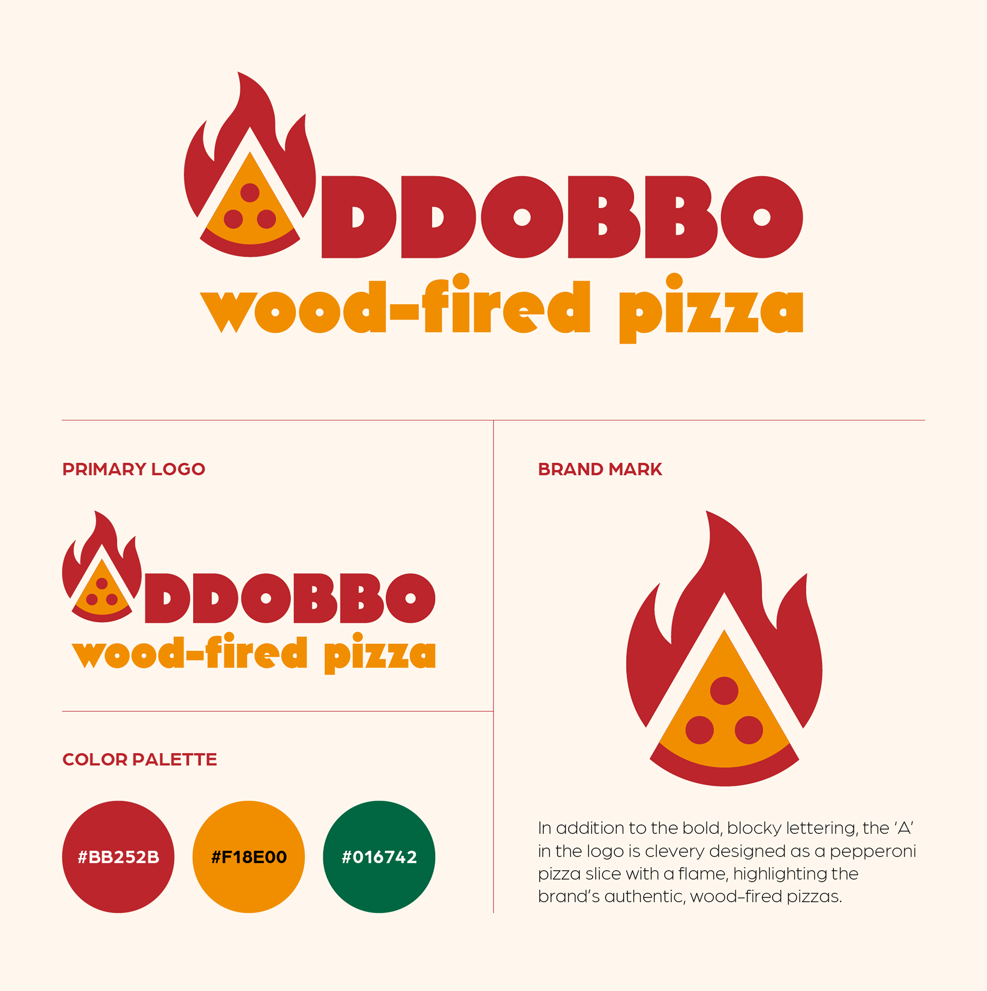 Freelance logo project for Addobbo Wood-Fired Pizza, a Florida pizzeria known for it's crispy-crust pies, pasta dishes, and desserts. The client had a specific vision for their brand mark: Big, bold lettering, with an 'A' made out of a flaming hot slice of pizza, and colors inspired by the Italian flag... and pizza!