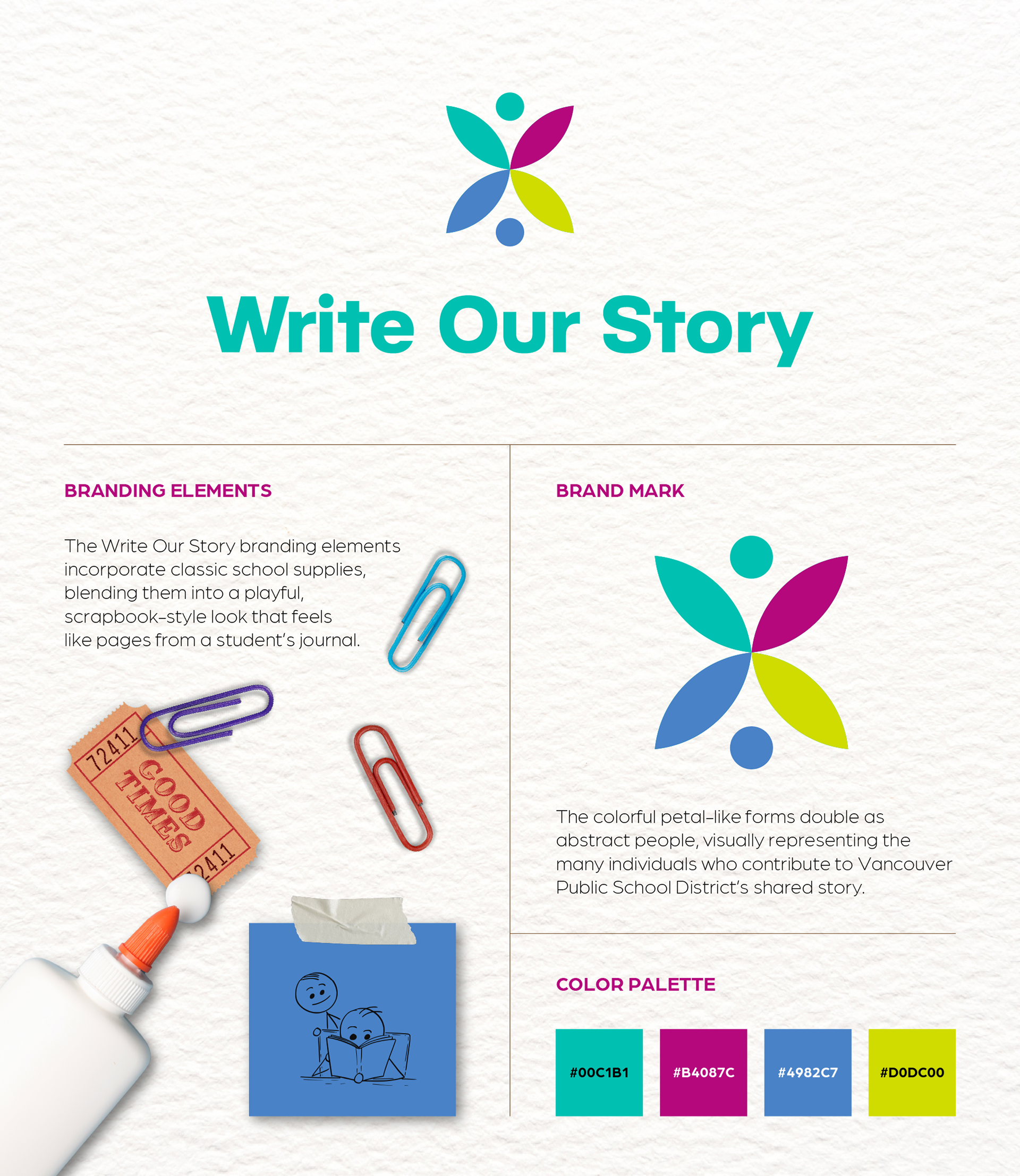 Write Our Story is Vancouver Public Schools' (VPS) strategic planning campaign, launched in 2022 to guide the district's vision through 2028. As lead designer, I was tasked with developing a brand mark and visual identity to accompany this effort.